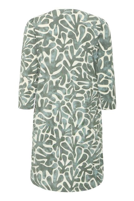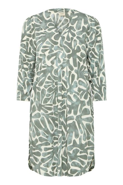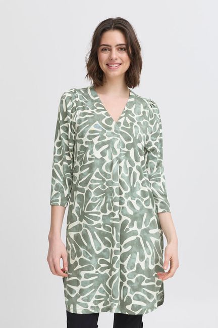 Ajaton ja toimiva Seen tunikamekko Fransa -merkiltä. Liukaspintainen mekko on tehty kauniin vihreällä kuosilla ja taskuilla. Mekossa on v-pääntie ja 3/4 osaiset hihat sekä pyöristetty helma halkioilla. Rypytetyt olkapäät tuovat kauniin naisellisen lisän. Loistava mekko arkeen sellaisenaan tai esimerkiksi caprien kanssa. Malli tunikassa on kapeahko, valitse yhtä pienempi kuin normaalisti käytät.