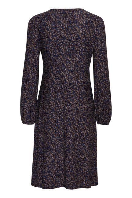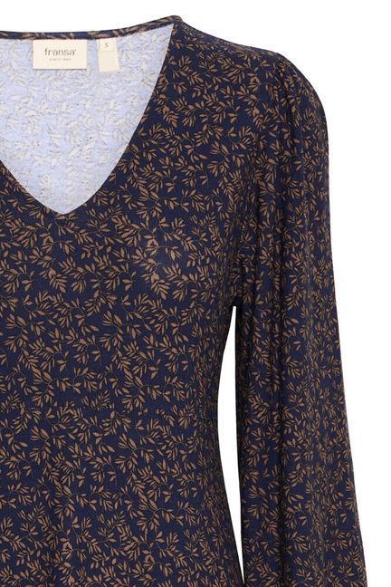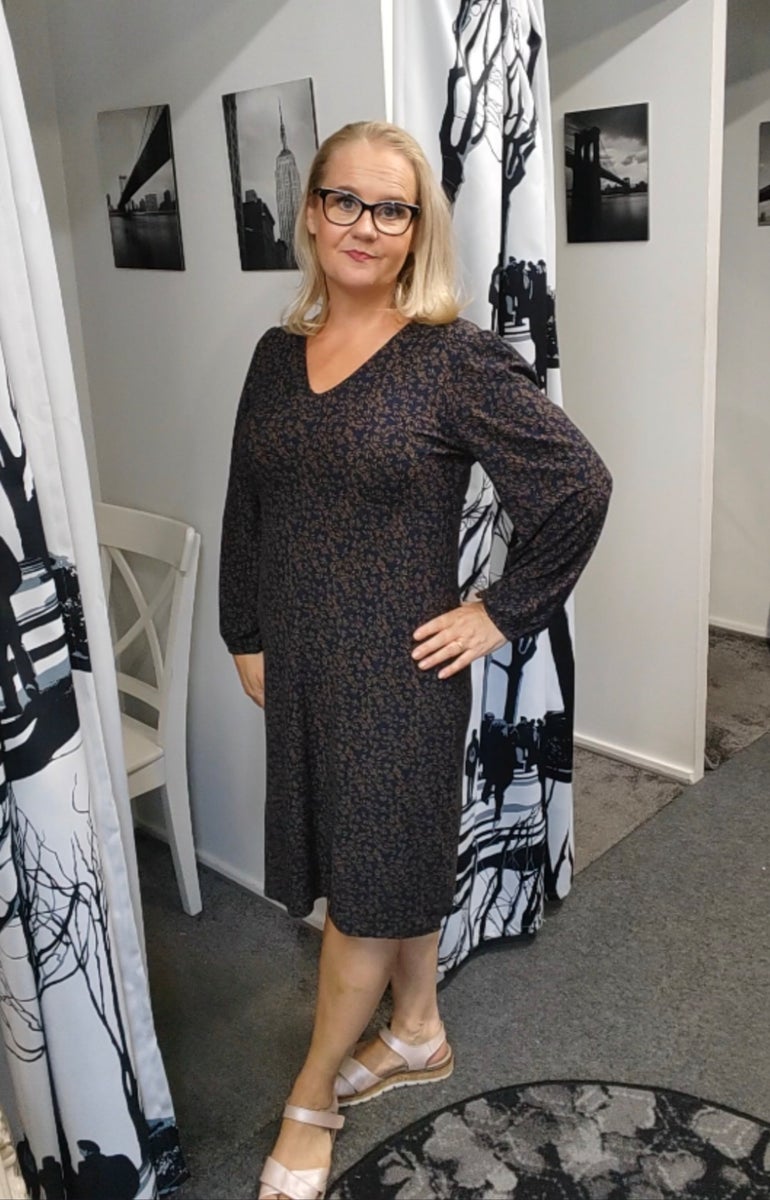 Laskeutuva ja ajaton trikoomekko Savoy Fransa -merkiltä. Kaunis naisellinen leikkaus mekossa. Tummansinisellä pohjalla pieniä ruskeita lehtikuvioita. Naisellinen v-pääntie ja mukavat pitkät hihat kuminauha hihansuilla. Monikäyttöinen mekko arkeen.