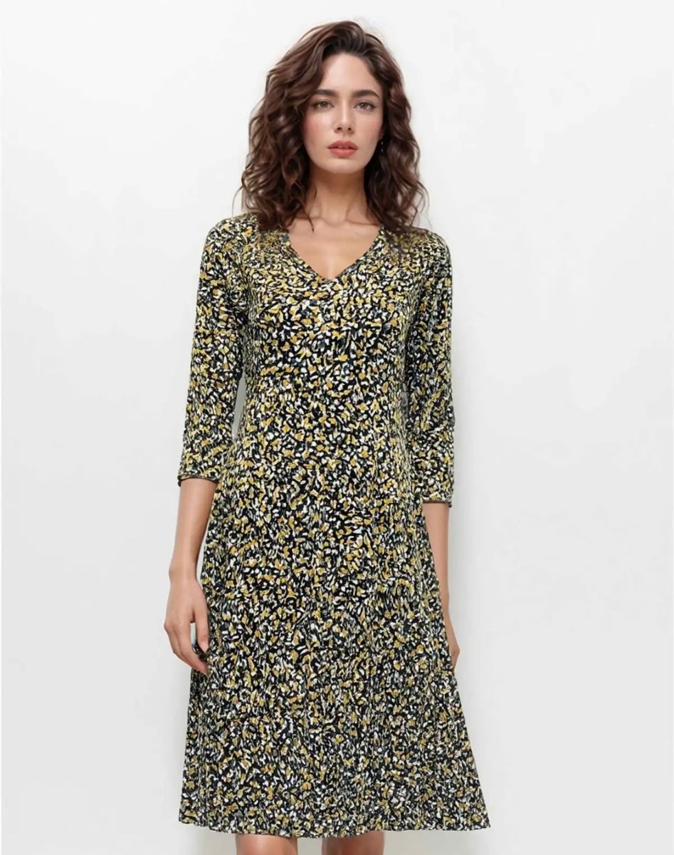 Klassikko mekko malli kauniilla syksyisellä värityksellä. Värinä vihreä. A-linjainen mekko on hyvin naisellinen ja hihat on 3/4 osaiset. Loistava mekko niin arkeen kuin juhlaan. Mekko ei rypisty, ei hiosta ja on helppohoitoinen.