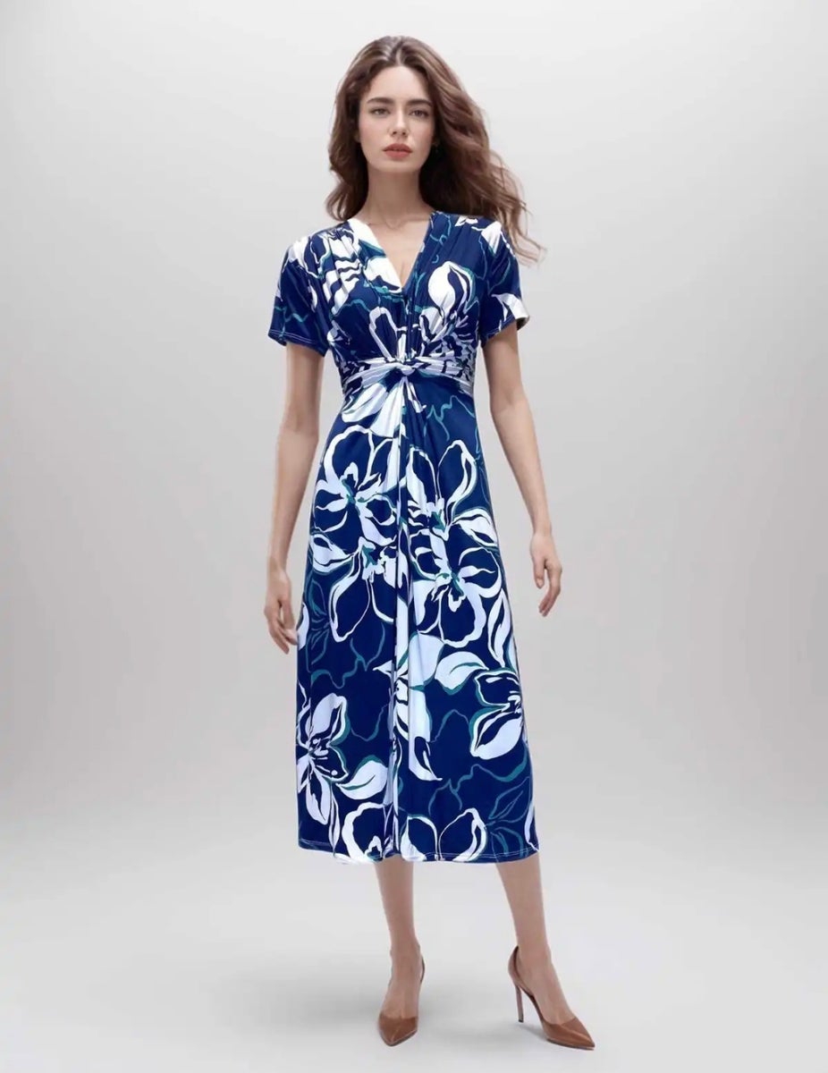 Upea maximekko rakkailla sinivalkoisin sävyin Joy's -merkiltä Pariisista. Maximekon edessä on solmuke ja rypytys sekä pienet hihat. Maximekossa on kaunis v-pääntie. Maximekko on joustava ja naisellinen. Hoikentava malli on väriltään syksyinen, jossa hiukan punaista. Mekon sivussa on samasta kankaasta nauhat, jotka voi sitoa taakse. Tässä maximekossa mielikin hymyilee. Mekon materiaali on laskeutuva, kevyt ja hengittävä. Upea mekko niin arkeen kuin juhlaan.