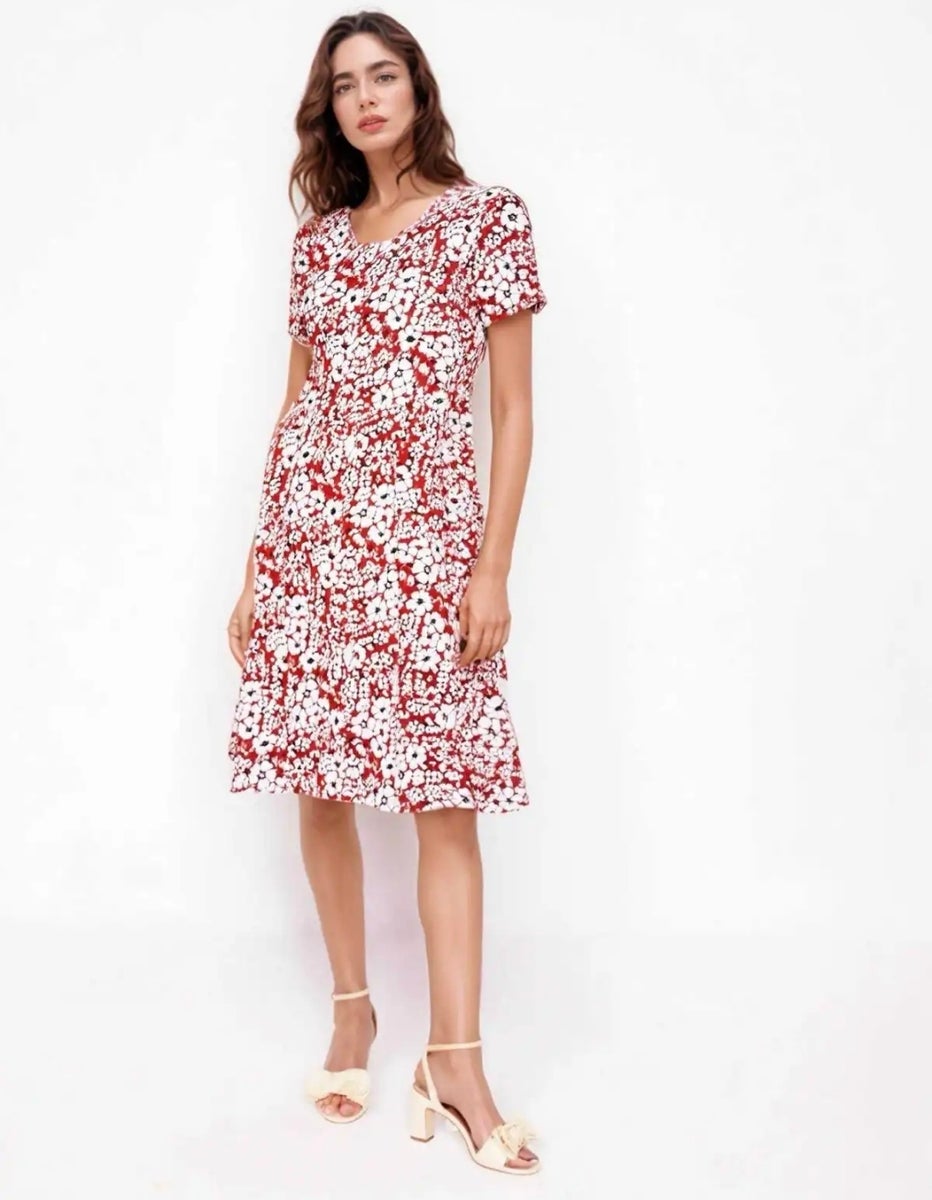 Mielettömän upea kukkamekko Joy's -merkiltä Pariisista. Mekossa on lyhyet hihat, pyöreä pääntie ja ihanan viileä päällä. Mekko on naisellisen A-linjainen. Mekkoa on sinivalkoisena ja punavalkoisena. Malli tuo naisellisuutta kaikille vartalomalleille. Asusteilla, koruilla, vyöllä tai esimerkiksi jakulla saat tästä mekosta juhlavan. Loistava mekko niin arkeen kuin juhlaan. Suosittu mekkomalli myös tuleviin tansseihin.