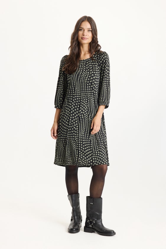 In Front Lucette -mekko on laskeutuva ja joustava mekko. Mekko on liukaspintaista trikoota jossa graafista khakinvihreää pallokuviota mustalla pohjalla. Mekossa on 3/4 osainen pussihiha, jossa olalla on rypytystä ja hihansuussa kaitale. Edessä on tyylikkäitä laskoksia ja alla joustava trikoovuori. Malli on istuva ylhäältä ja väljempi helmasta, A-linjainen. Materiaali on huoletonta pese ja pidä kangasta. Todella ihanan tuntuinen päällä ja sopii moneen menoon !