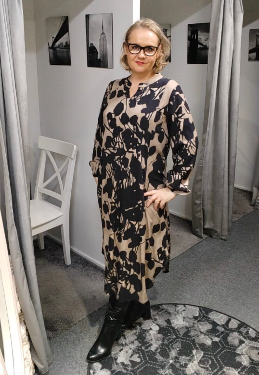 Erittäin kaunis ja monikäyttöinen Sammy Mie mekko Pont Neuf -merkiltä. Väri on lämmin ruskea/musta sävyinen jossa lehtioksa printti. Kevyt v-pääntie kauluksella, taskullinen sekä kuminauhalliset pitkät hihat. Mekko on edestä vähän lyhyempi kuin takaa. Ajaton ja ympärivuotiseen käyttöön sopiva mekko.