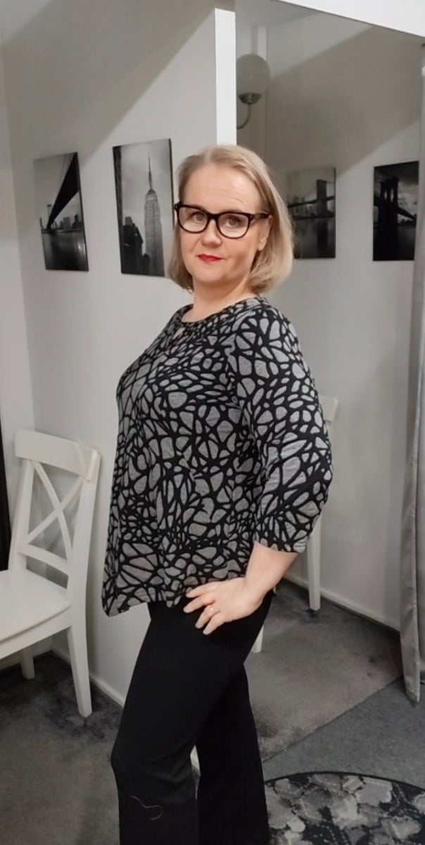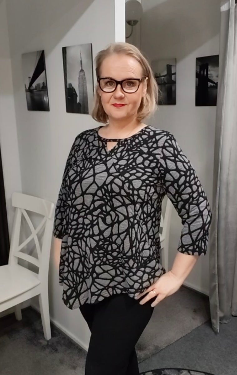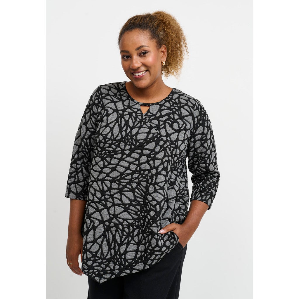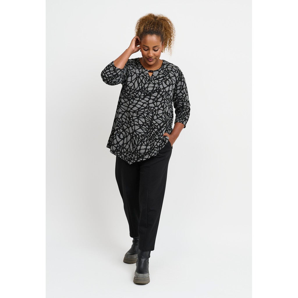 Supersuosittu Magrethe -tunika Pont Neuf -merkiltä. Hieno musta/harmaa pusero, jossa on 3/4-pitkät hihat ja pyöreä kaula-aukko, jossa on pieni avaimenreiän leikkaus. Puserossa on klassinen istuvuus ja se on valmistettu laadukkaaseen viskoosilaatuun. Tunikan pinta on strukturoitu. Loistava musta tunika niin surujuhliin kuin arkeen. Pont Neuf vaatemallisto on plusmitoitusta.