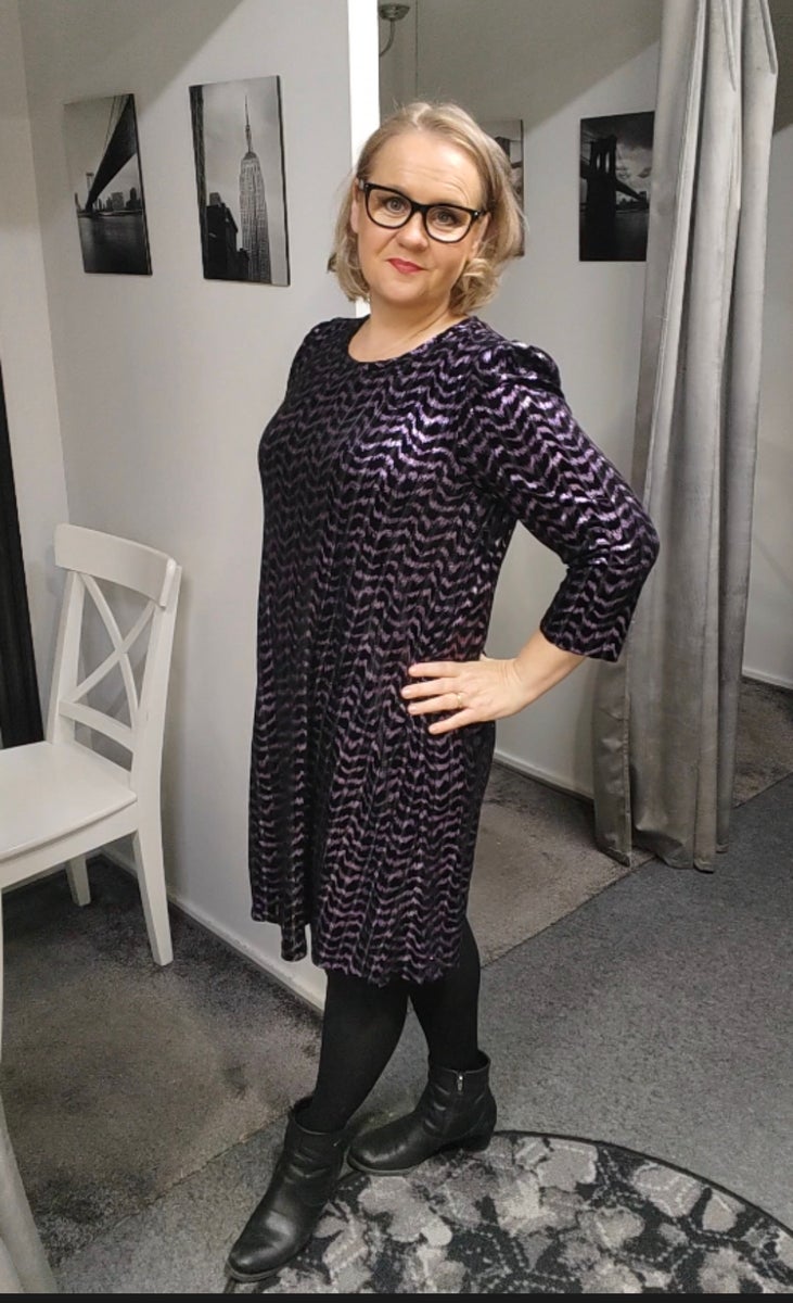 Juhlava Iva mekko Ze-ze -merkiltä. Kimalteleva samettinen violetti/musta mekko hiukan vajailla hihoilla. Taskut molemmin puolin mekossa. Naisellinen A-linjainen mekko. Mekossa on pyöreä pääntie ja musta vuorimekko. Loppuvuoden näyttävä juhlamekko.