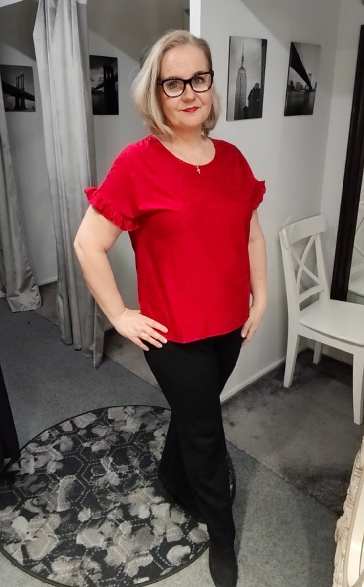 Kaunis punainen Olga pusero Pont Neuf merkiltä. Kevyesti kiiltävä pusero aidon punaisena. Kauniit hihat ja suora helma. Pont Neuf vaatemallisto on plusmitoitusta