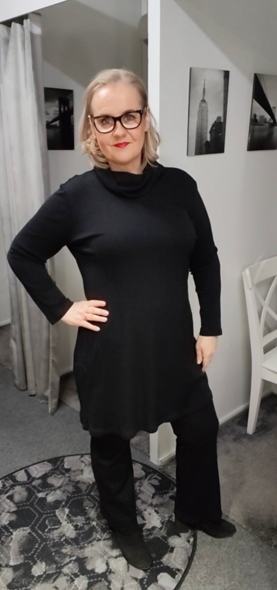 Todella laadukas merinovilla poolomekko suomalaiselta Niccolei -merkiltä. 100% merinovilla on kudottu ja valmistettu Orimus -neuleella Suomessa. Helppohoitoinen merinovilla on lämmin, mutta kuitenkin ohutta laskeutuvaa kangasta. Mustassa poolotunikamekossa on hiukan tiputetut hihat olkapäältä, isohko poolokangas kaulus, pitkät hihat ja suora malli. Poolotunikamekko on reilua mitoitusta.