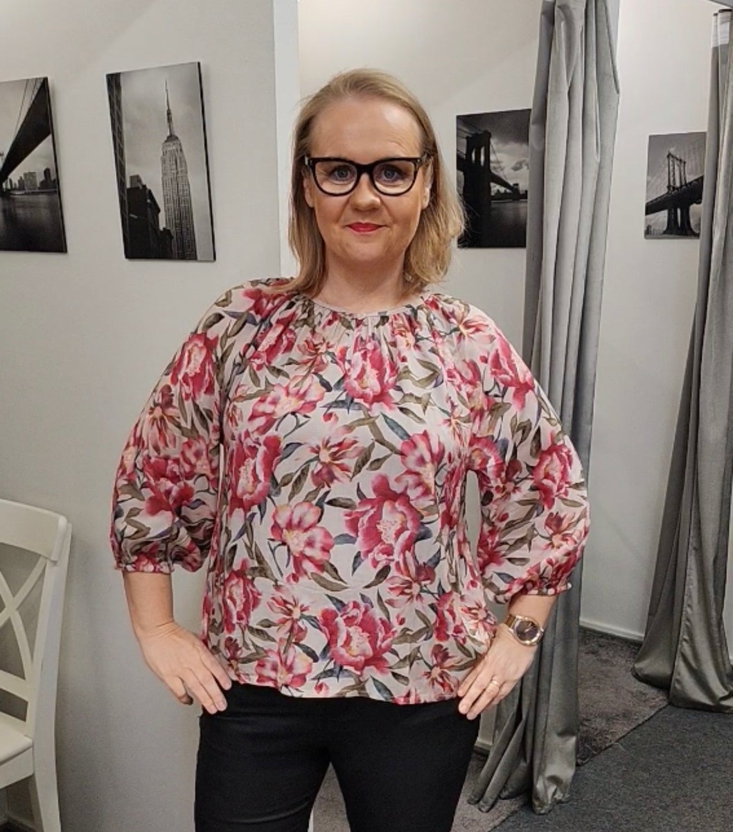 Samsa -puserossa on kaunis kukkakuosi ja upeat värisävyt. Puserossa on väljähkö, hyvin laskeutuva malli ja puolipitkät hihat. Pääntiessä pieni nappi, jonka voi halutessaan jättää myös auki. Värivaihtoehtoja on violetti, roosa, hiekka ja ruska.