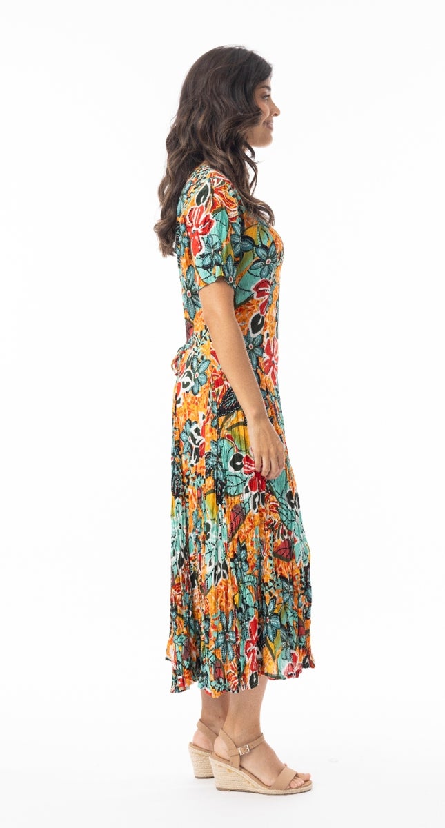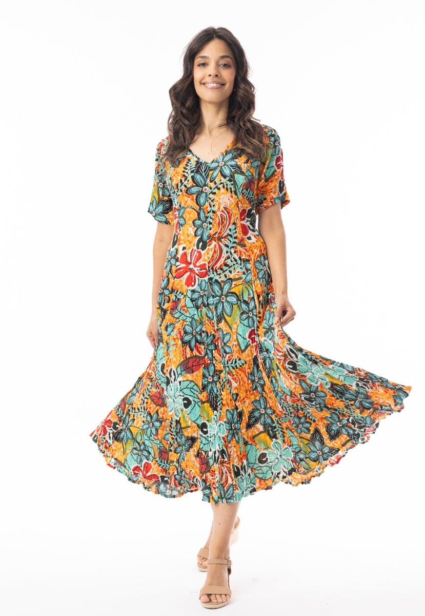 Raikkaan värikäs lyhythihainen Guaratiba - kesämekko Orientique Australialta. Mekossa on siro v-pääntie ja kevyesti laskeutuva. Mekko on kevyt ja hengittävä, sekä tuntuu miellyttävältä koko päivän ajan. Ryppyefektin voi säilyttää kiertämällä mekko kierteelle pesun jälkeen ja kuivattaa se rullalla. Erinomainen valinta niin arkeen kuin kesäisiin juhlahetkiin.